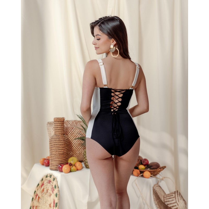 Redefine tu silueta con una pieza que equilibra sofisticación y seguridad. Este enterizo cuenta con copas enteras de gran cobertura que brindan un soporte excepcional, ideal para quienes buscan firmeza y comodidad total. Sus cortes laterales estratégicos crean un efecto visual de cintura más estilizada, mientras que el amarre tipo corset en la espalda te permite personalizar el ajuste a tu medida exacta. Una prenda diseñada para destacar con confianza bajo el sol.