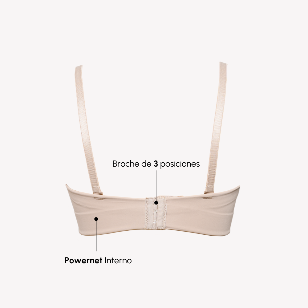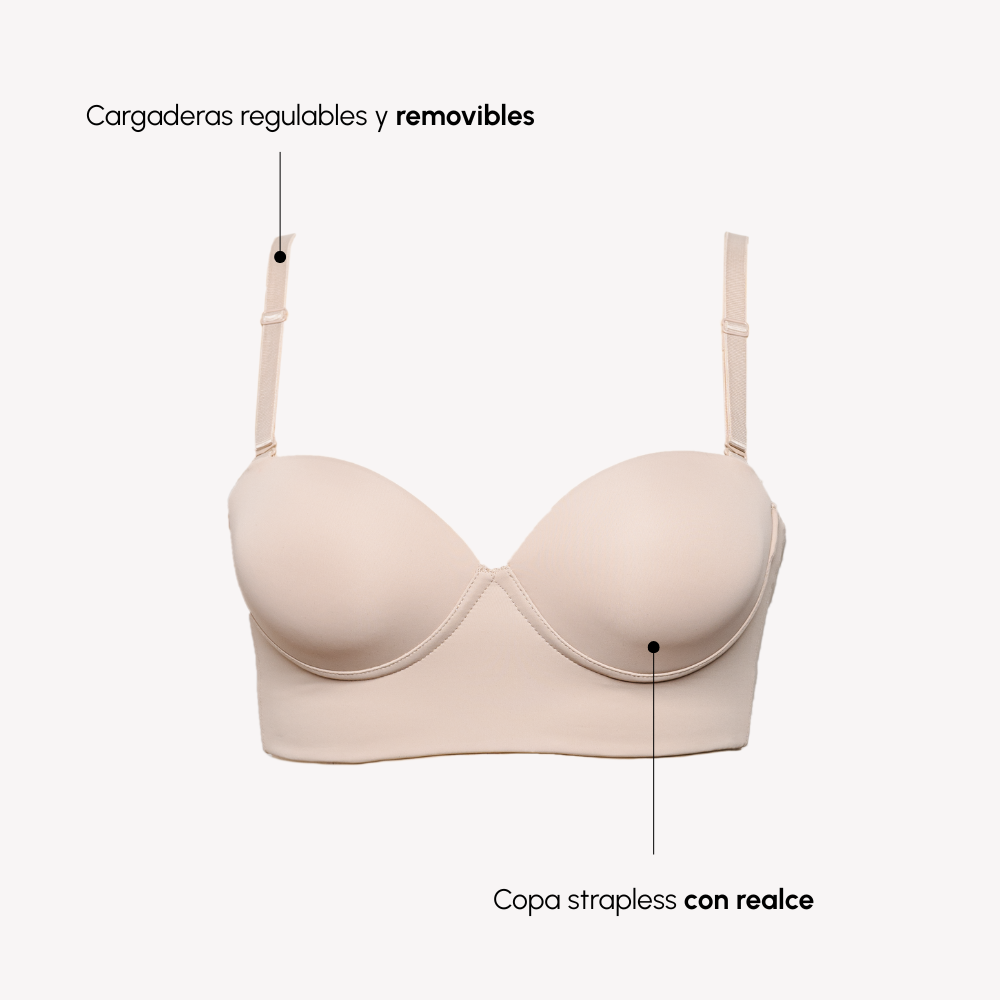 Brasier strapless con realce y estructura firme, diseñado para brindar sujeción segura y comodidad en bustos medianos y grandes.